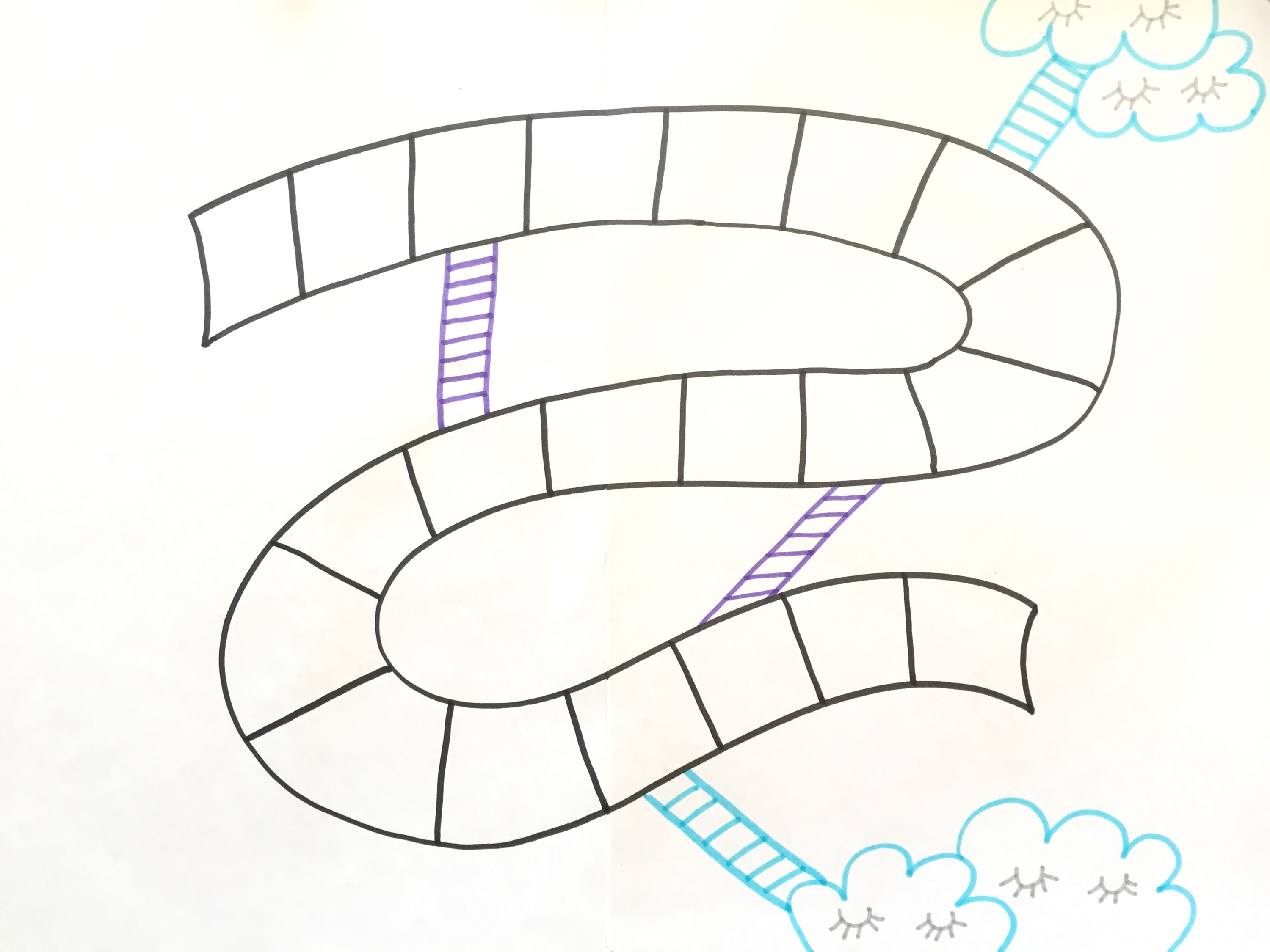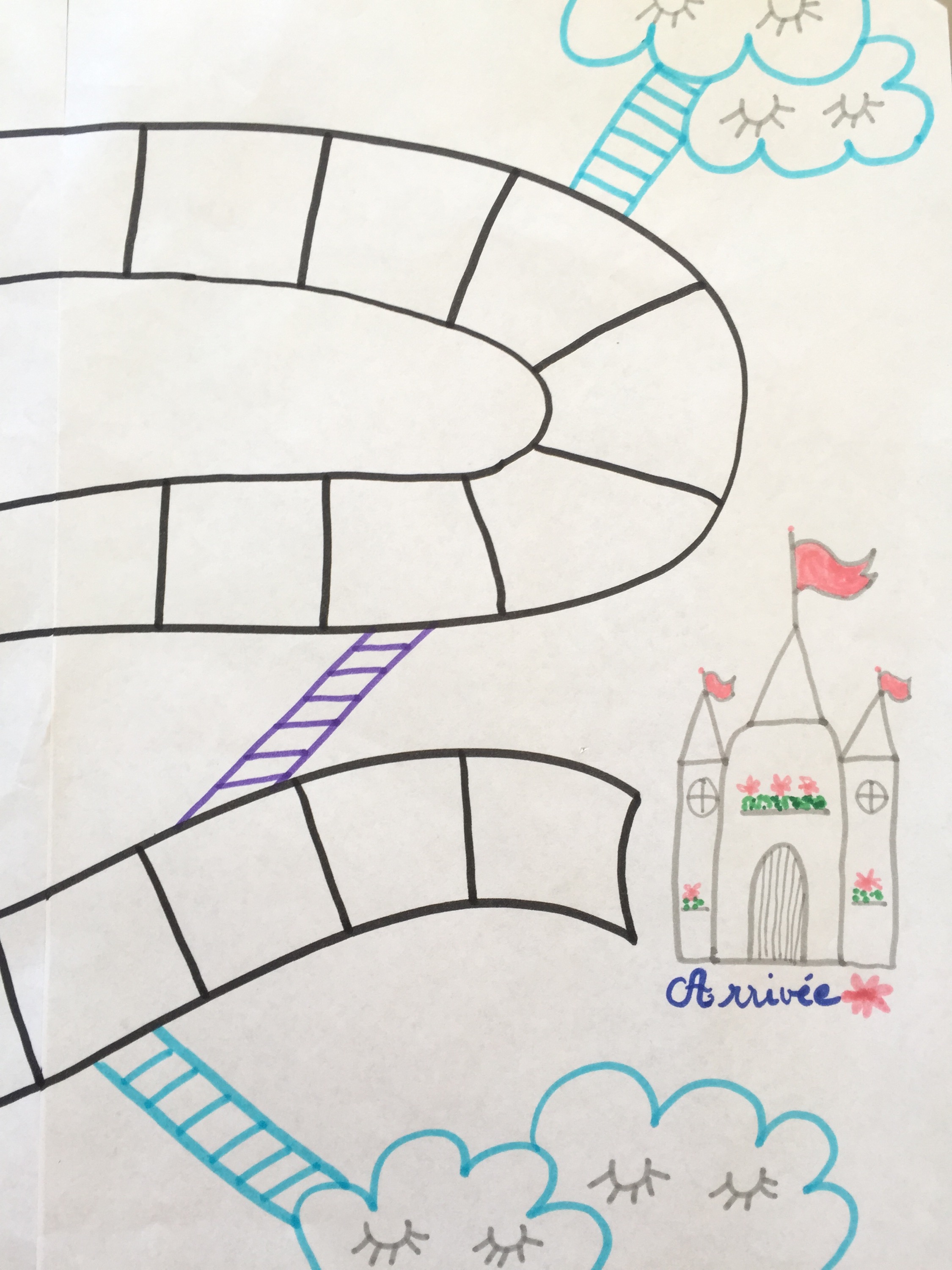 Commencer par scotcher les deux feuilles A4, puis tracer la base du jeu en noir. Au fur et à mesure, dessiner des décors, des dessins dans les cases, des échelles, des cases « pièges » etc