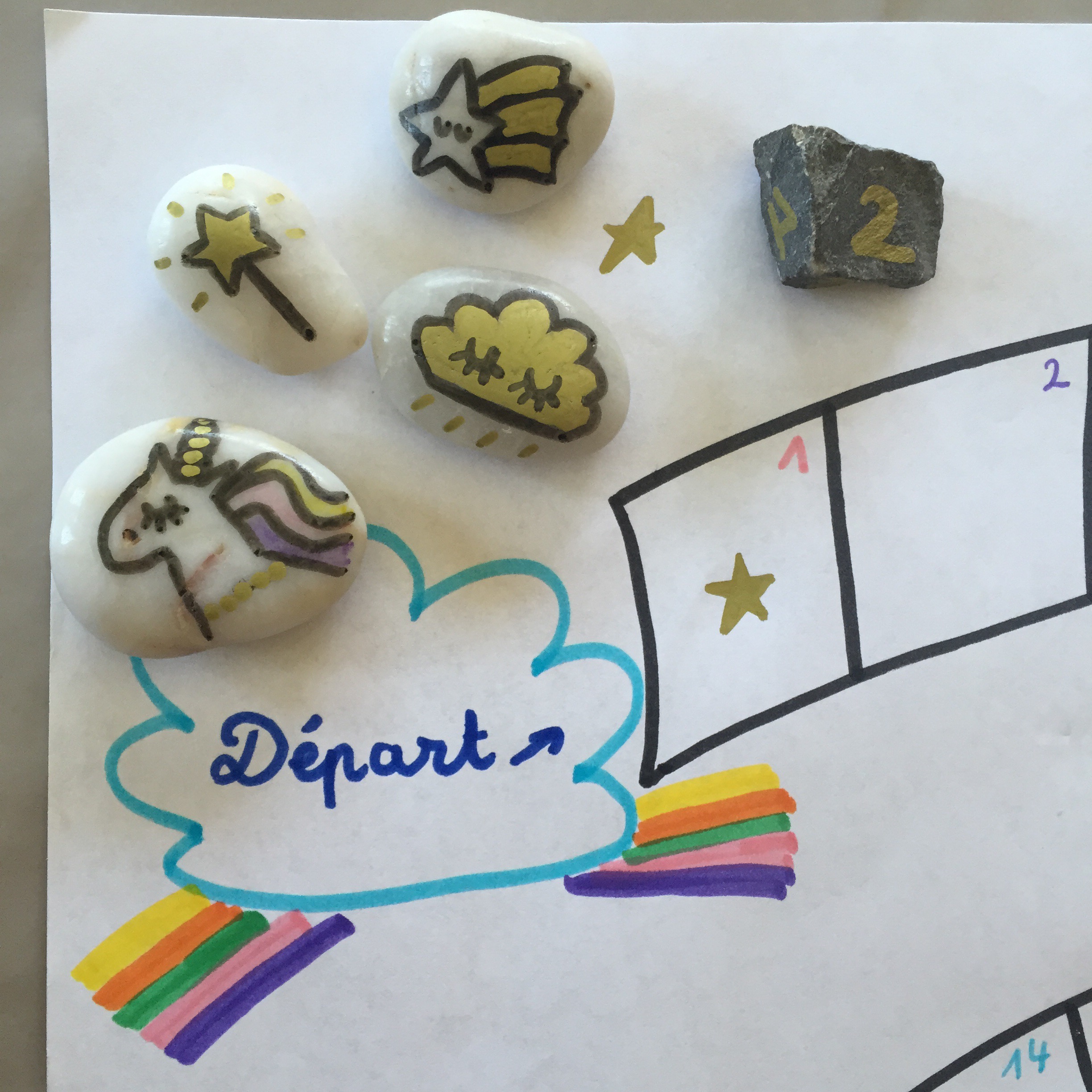 – Des galets pour faire les pions et un caillou aux bords bien plats pour le dé (le notre n’a que 5 faces 😉 )