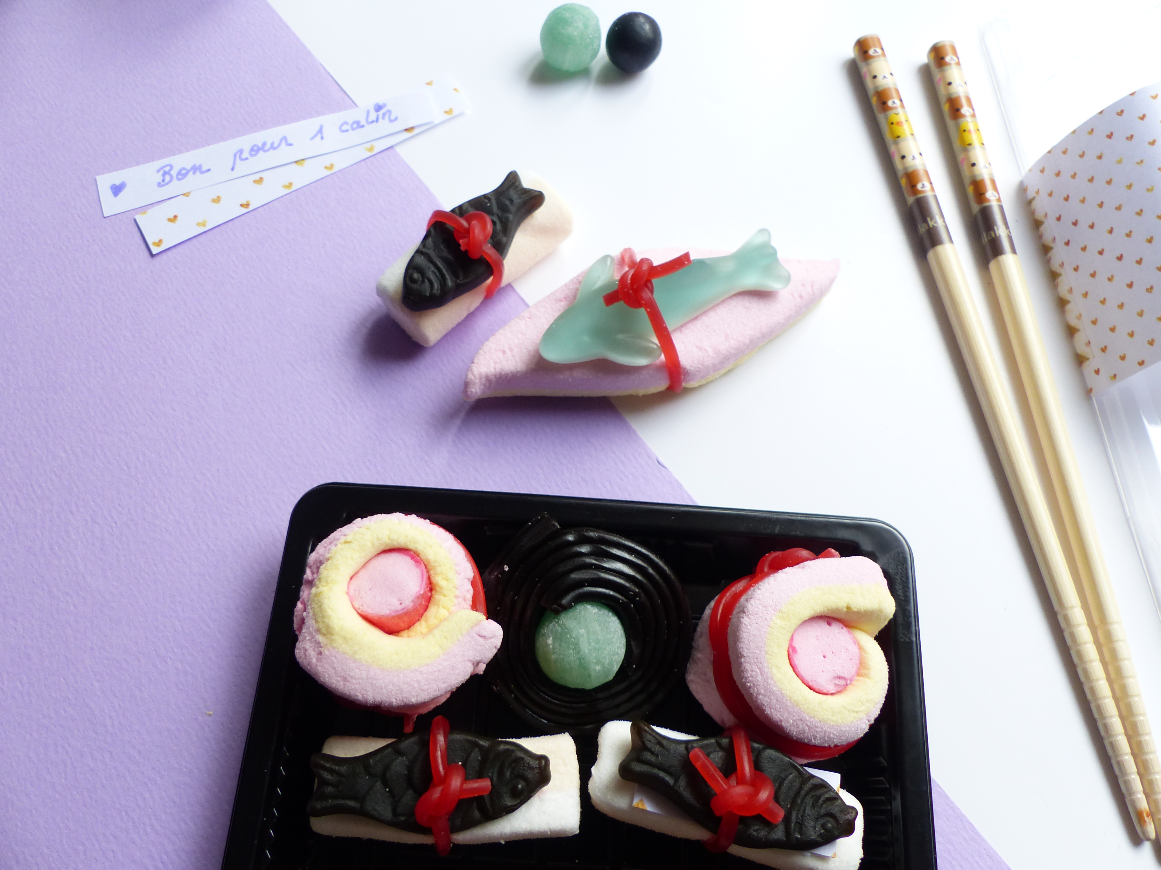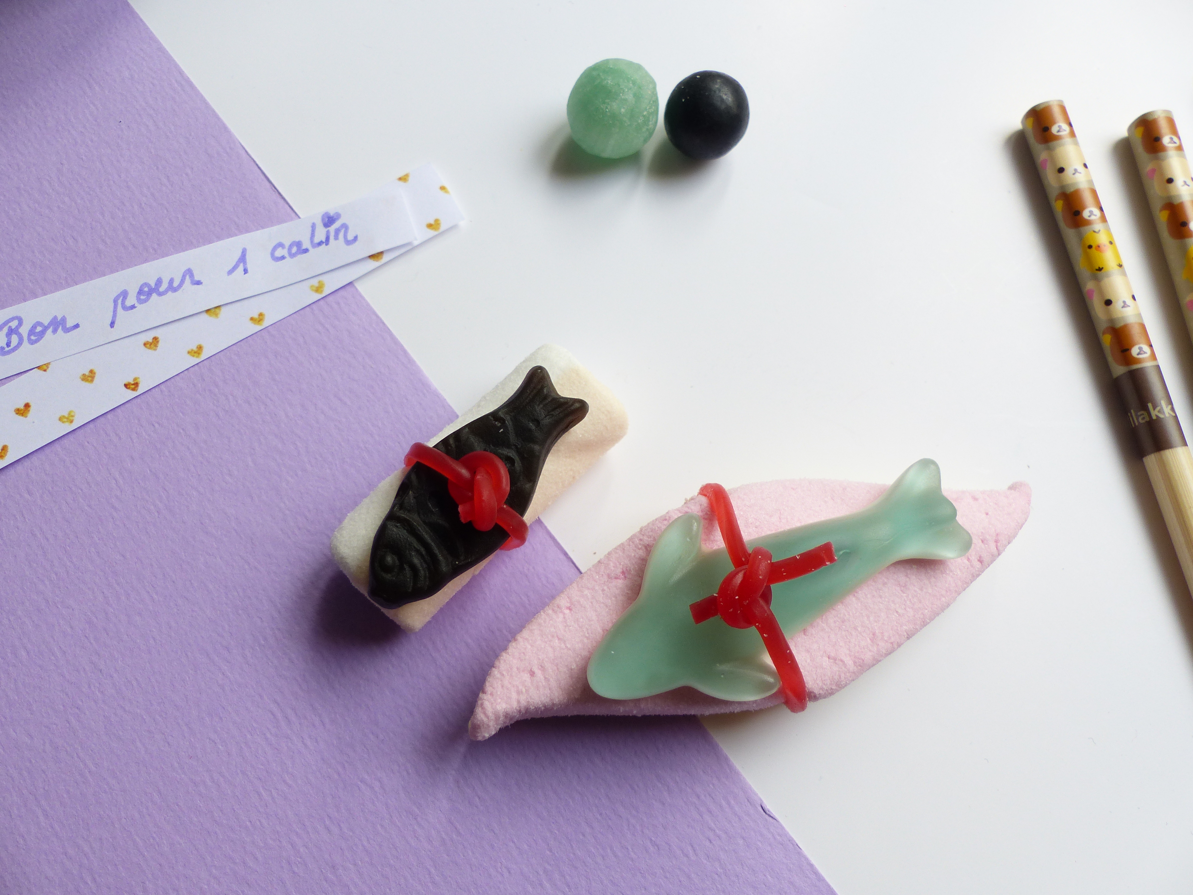 Ensuite on les insèrent dans nos sushis ou california. J’ai choisi de faire les sushis avec guimauve et bonbon que je tiens avec un fil coloré.
