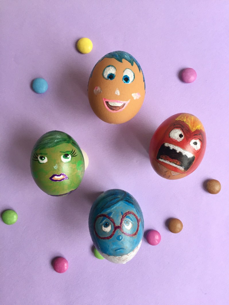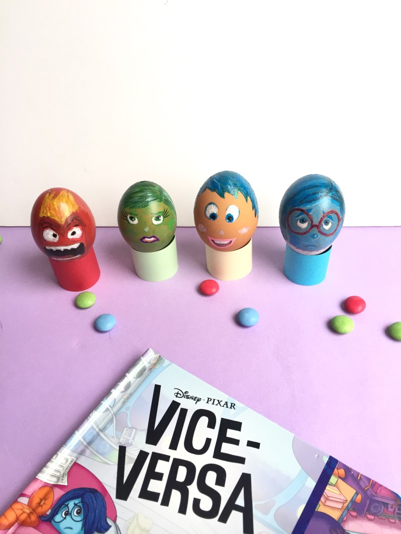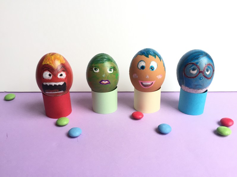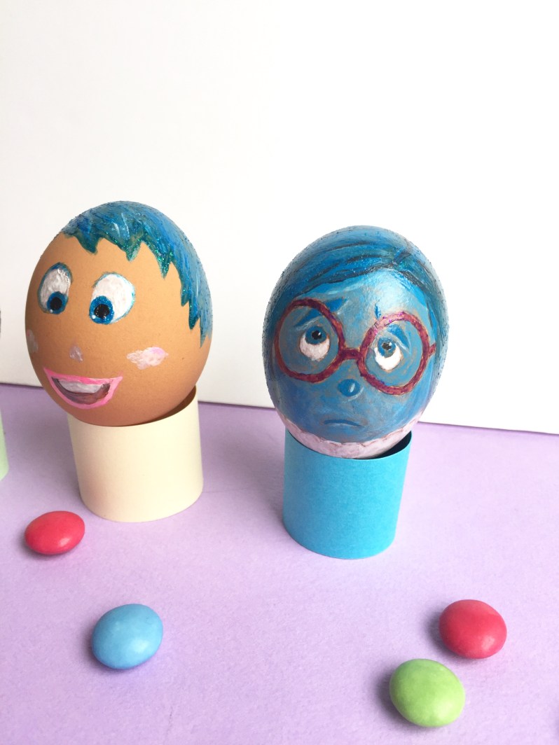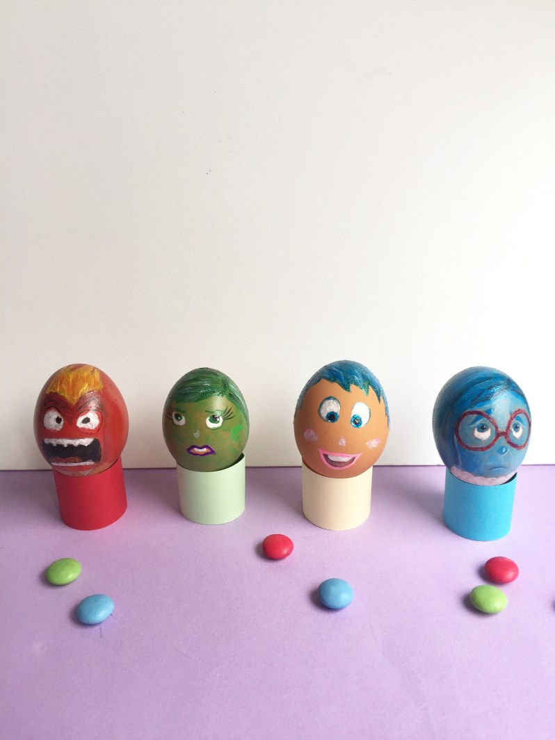 Pour ajuster le tuto pour des kids, vous pouvez leur faire peindre les œufs dans les couleurs des émotions : Bleu, vert, rouge, violet, et leur faire coller des yeux autocollants.