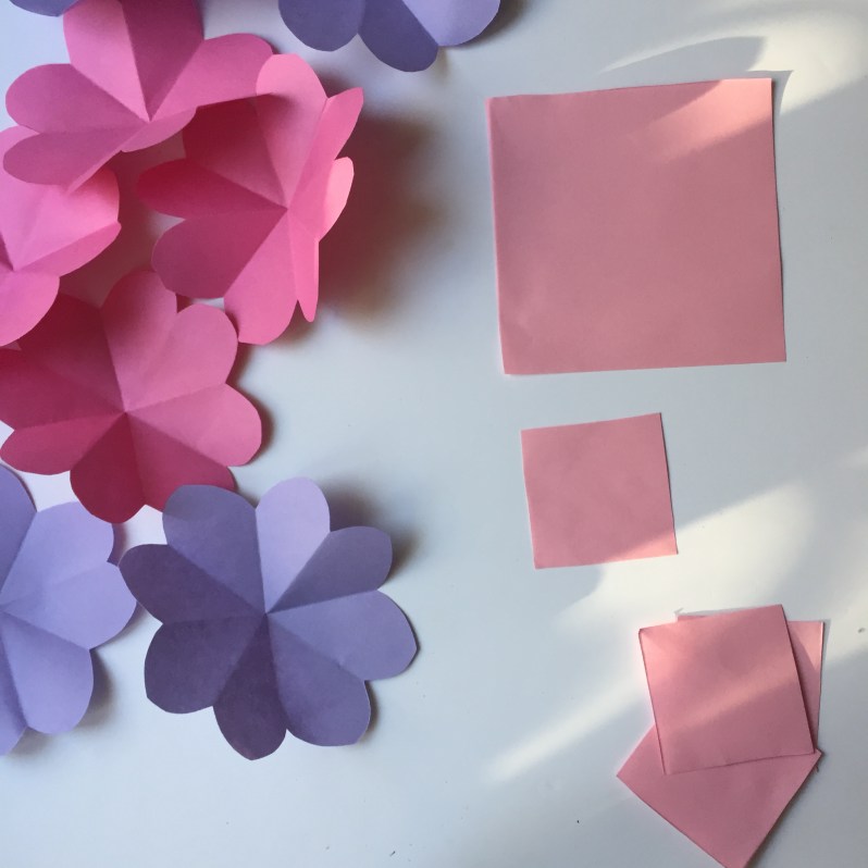 Pour faire une fleur, découper un carrée, le plier en 4, puis en deux pour obtenir un triangle. Pour finir découper en arrondi la pointe du triangle, déplier votre ouvrage pour découvrir votre fleur!