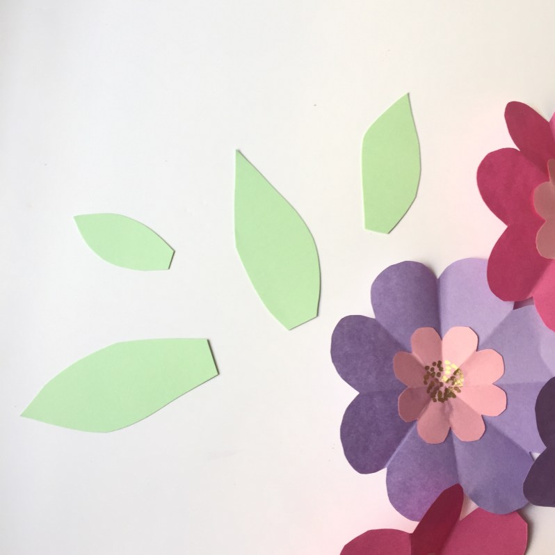 Commencez par coller une des fleurs au centre de la pliure puis les feuilles autour.