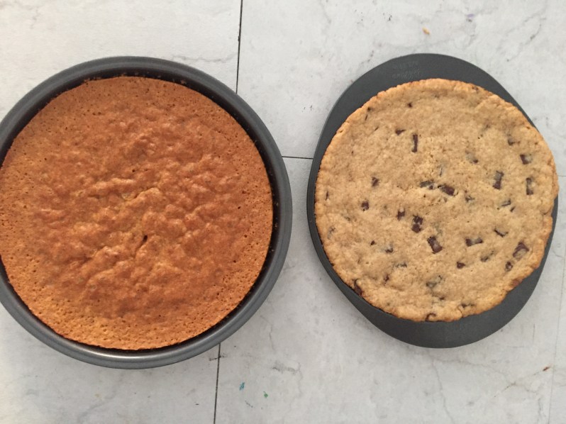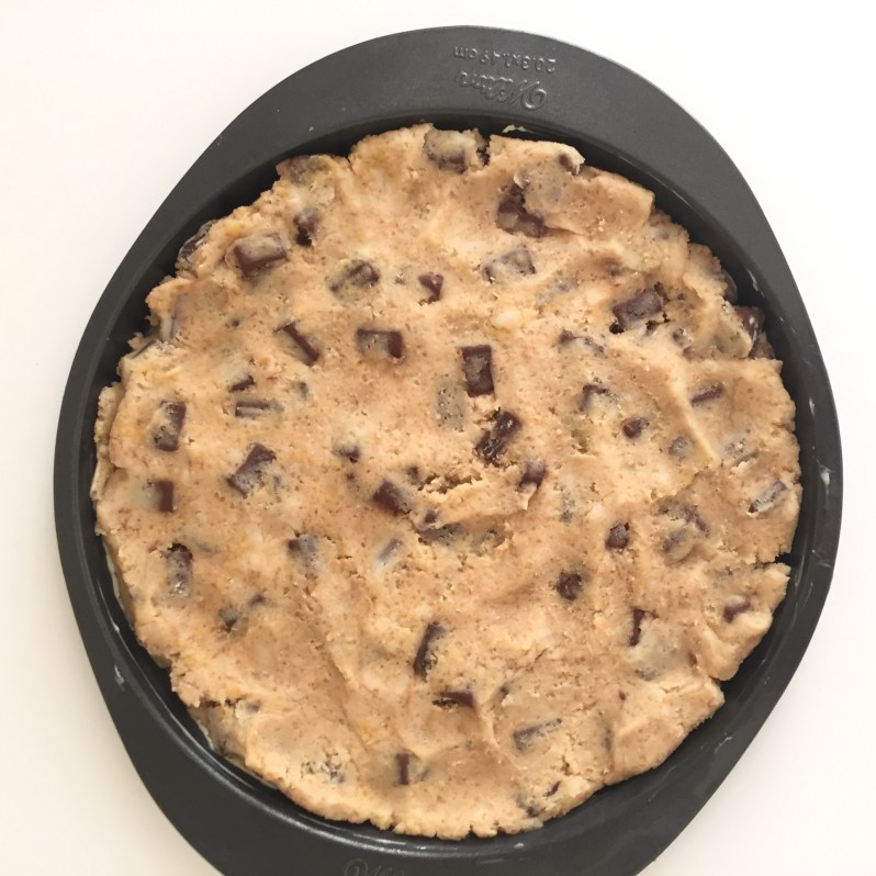 Comme je voulais faire un peu original j’ai fait un cookie géant! J’ai utiliser un plat à bord bas pour qu’il soit bien rond et je l’ai laissé environ 12 min au four 🙂