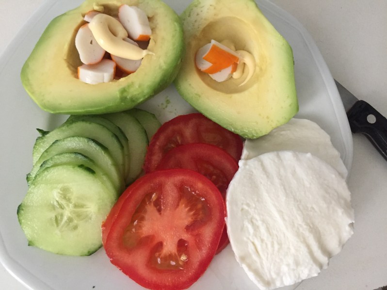 Pour cette recette gourmande, il vous faut: un avocat, du concombre, de la tomate, de la mozarella et du surimi (ou du saumon).