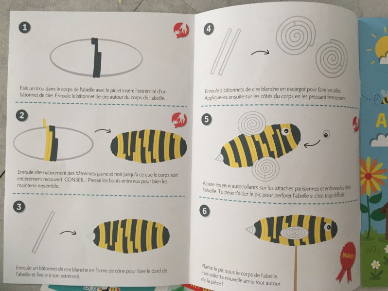 Tout le matériel était dans le kit, et j’ai apprécier utiliser des fournitures originales: il s’agissait de fabriquer une abeille avec du polystyrène et des bandes de cire!