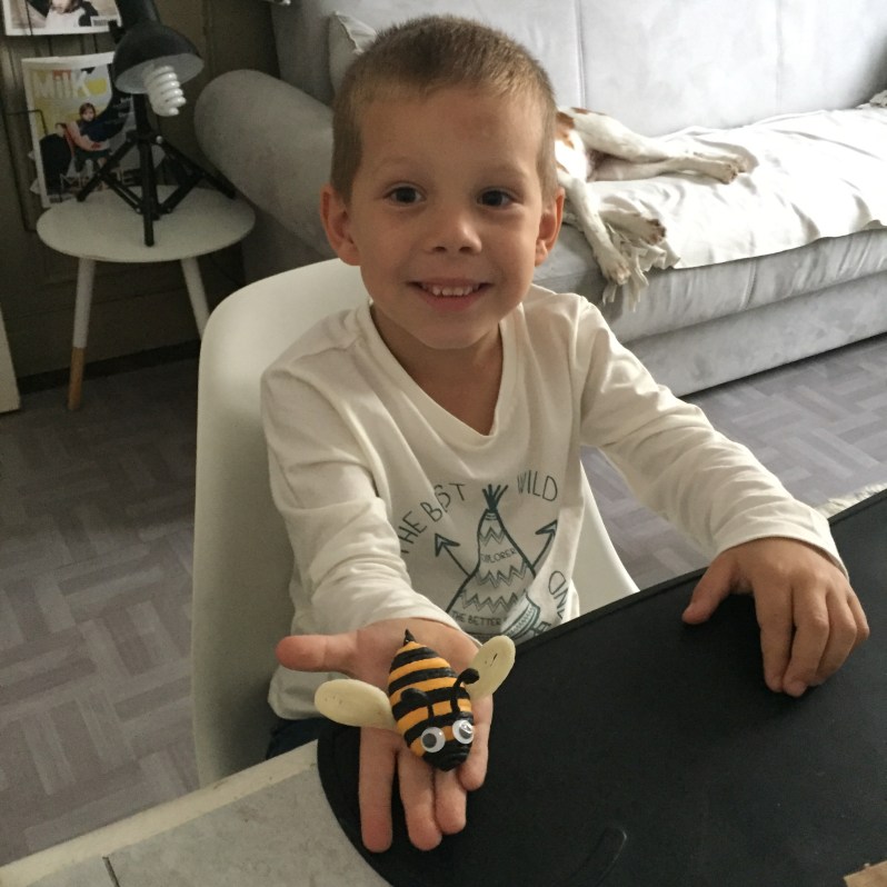 Maé a été très appliqué et il a très bien réussi à faire son abeille, le choix de la cire est très bien pour les petits.
