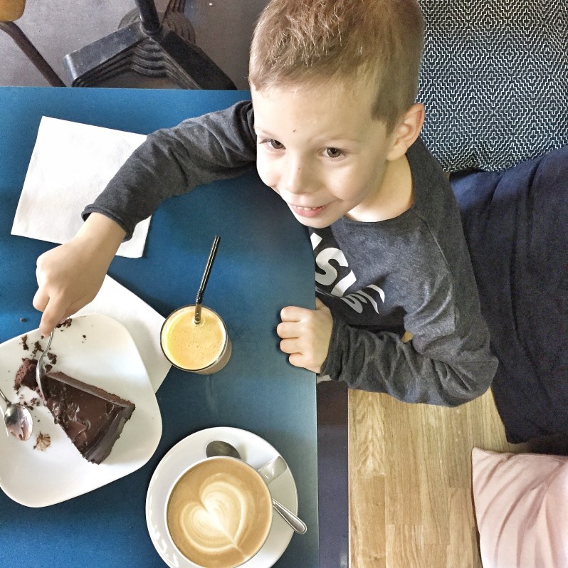 On a bu du jus de fruits fait minute, pour moi un café latté et nous avons mangé un gâteau chocolat-café exquis 🙂