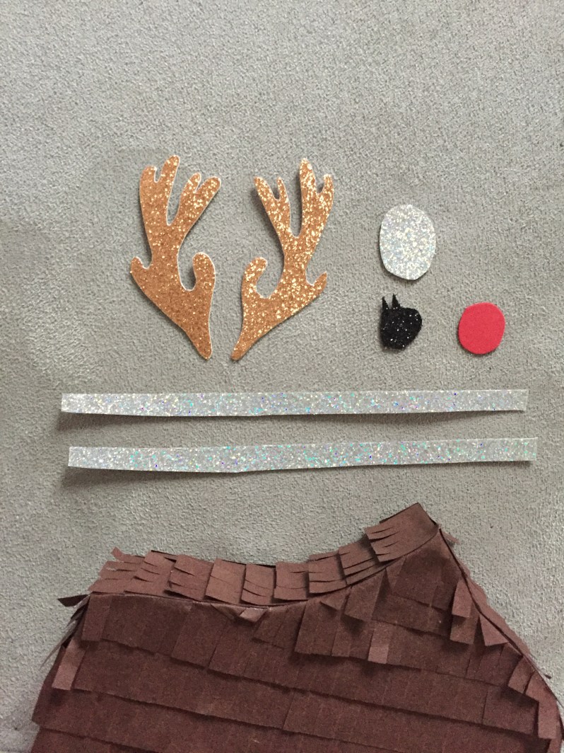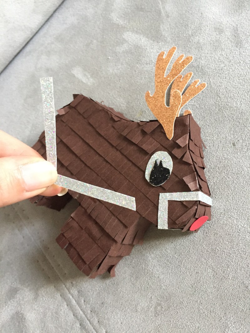 Pour finir, pour décorer le renne, on découpe du papier pailleté pour les détails, ou du papier cartonné si vous n’en avez pas.