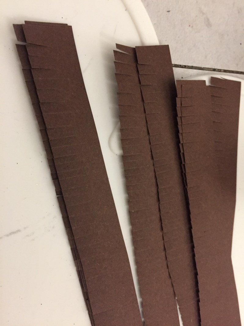 J’ai donc découpé des bandes à peu près égales de papier marron, puis j’ai découpé des franges tout le long (vous pouvez couper plusieurs bandes de papier en même temps!)