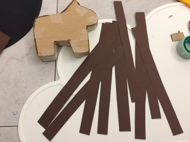 Ensuite j’ai fixé la bande de carton tout autour du corps du renne à l’aide de scotch à l’intérieur.