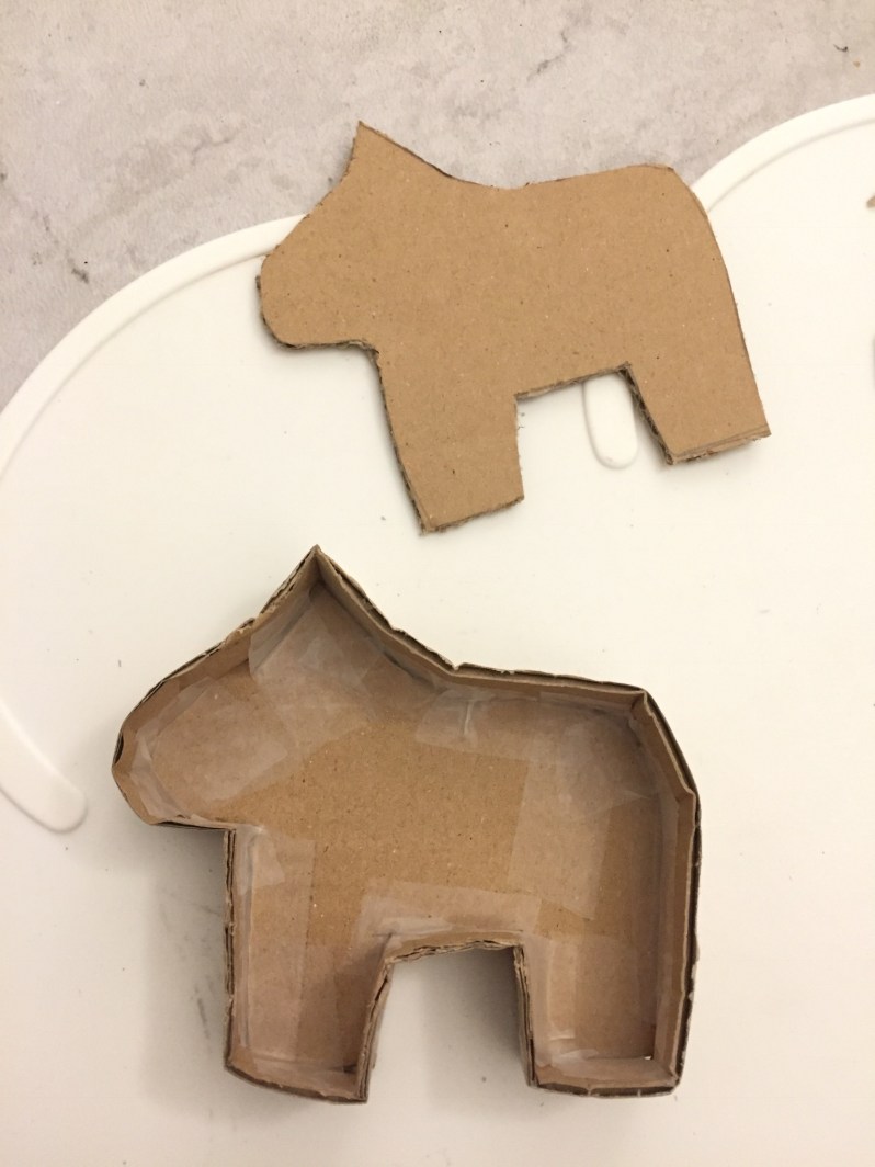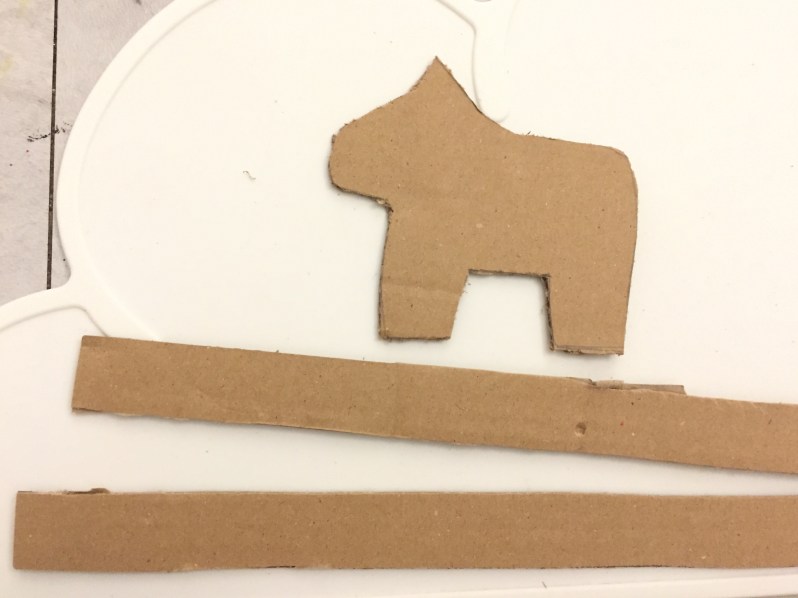 Ensuite j’ai découpé deux fois la forme du renne dans du carton. Il vous faut aussi des bandes de carton de la même largeur, c’est ce qui donnera la tranche du renne.