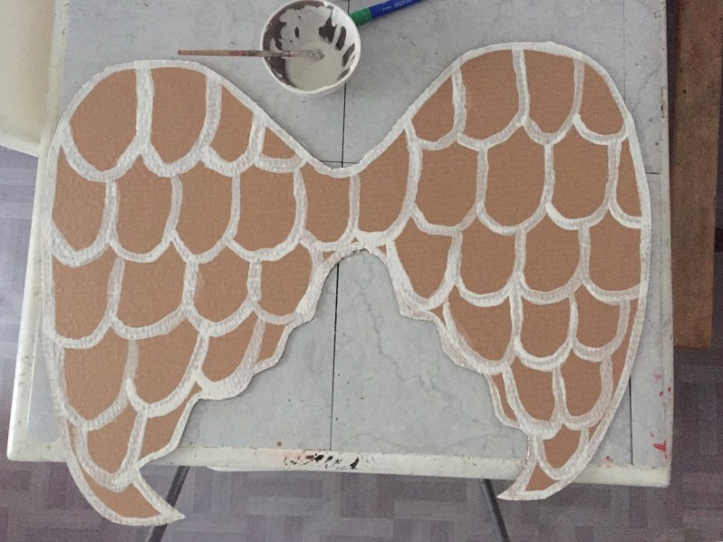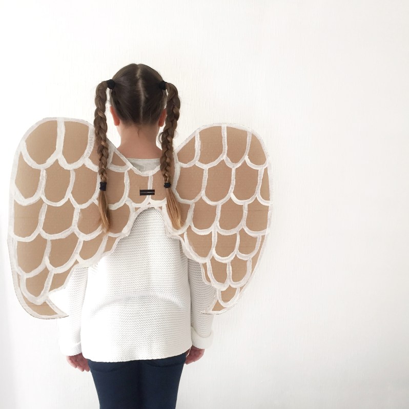 Décidément, tu/ vous ne nous avais pas menti sur ton amour du carton ! Je trouve que la forme des ailes est très jolie. Par contre, j’aurai peint le tout en blanc et fait les contours de plumes en doré… Après cela demande un peu plus de temps et de peinture !