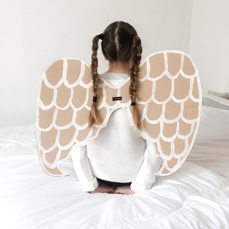 On a donc eu l’idée de faire un petit déguisement de dernière minute, avec du carton, pour se transformer en ange!
