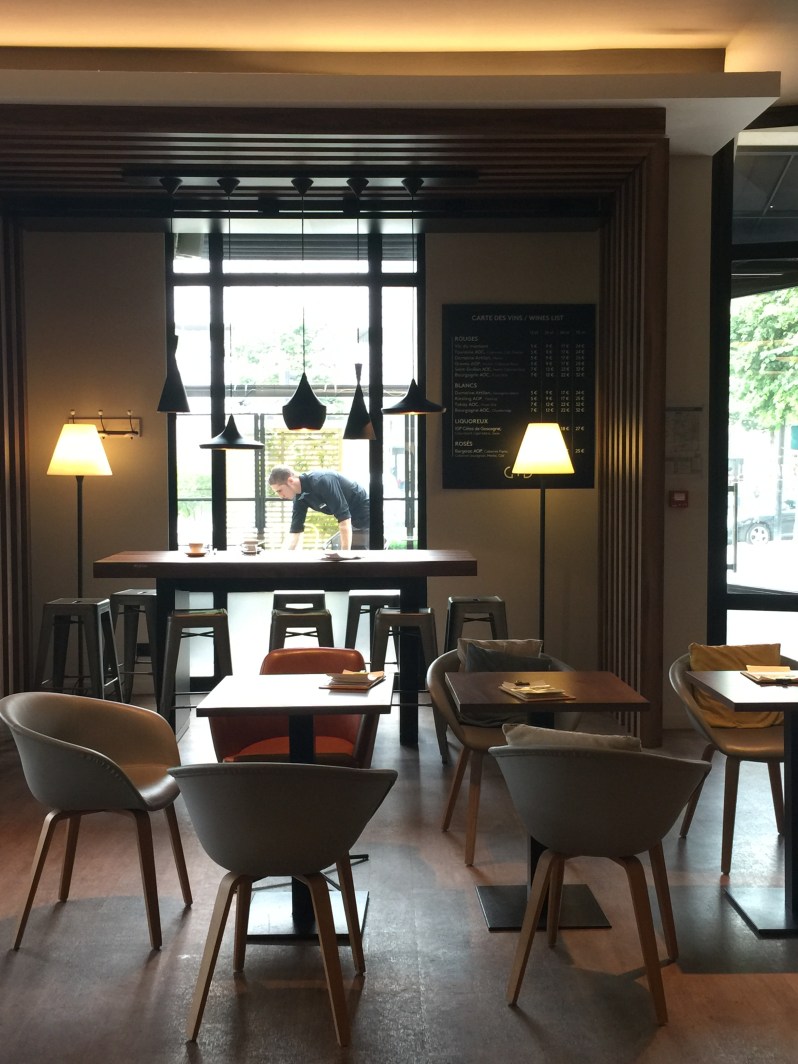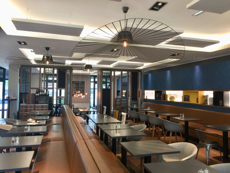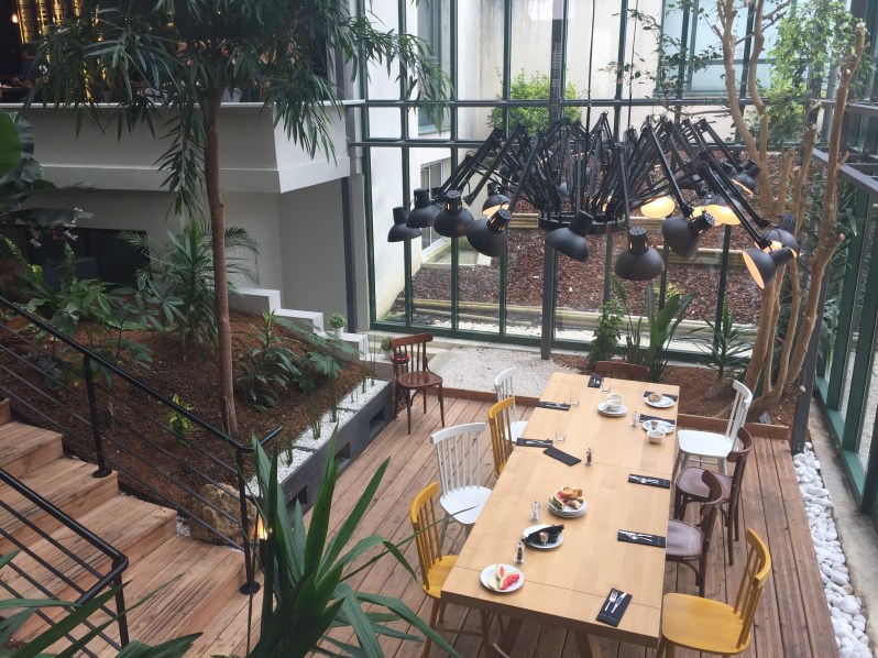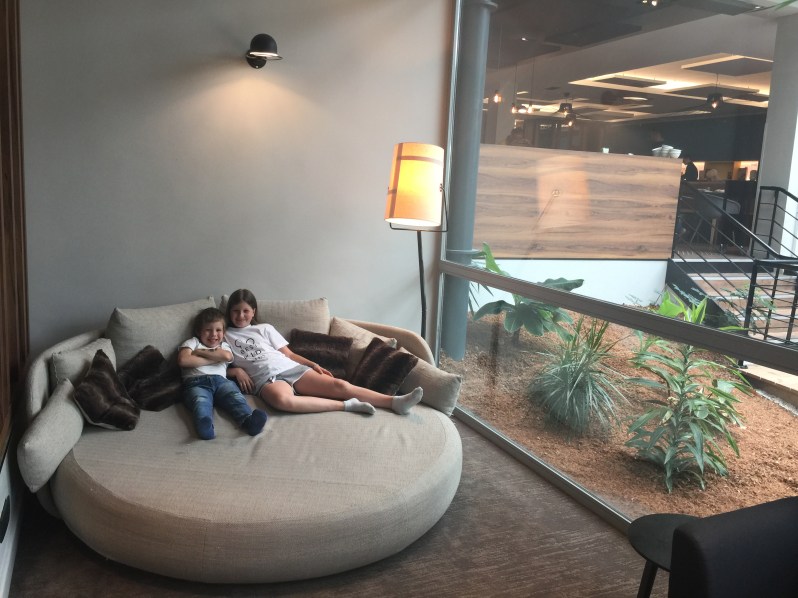 Les différents « spots » du rez de chaussée, un côté cocooning avec espace pcs, un espace café/bar avec bibliothèque, un espace avec tablette et grande table en bois.. nous font nous sortir au calme malgré un hôtel assez imposant 🙂
