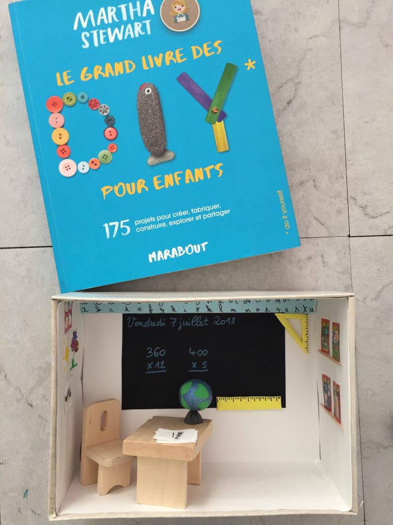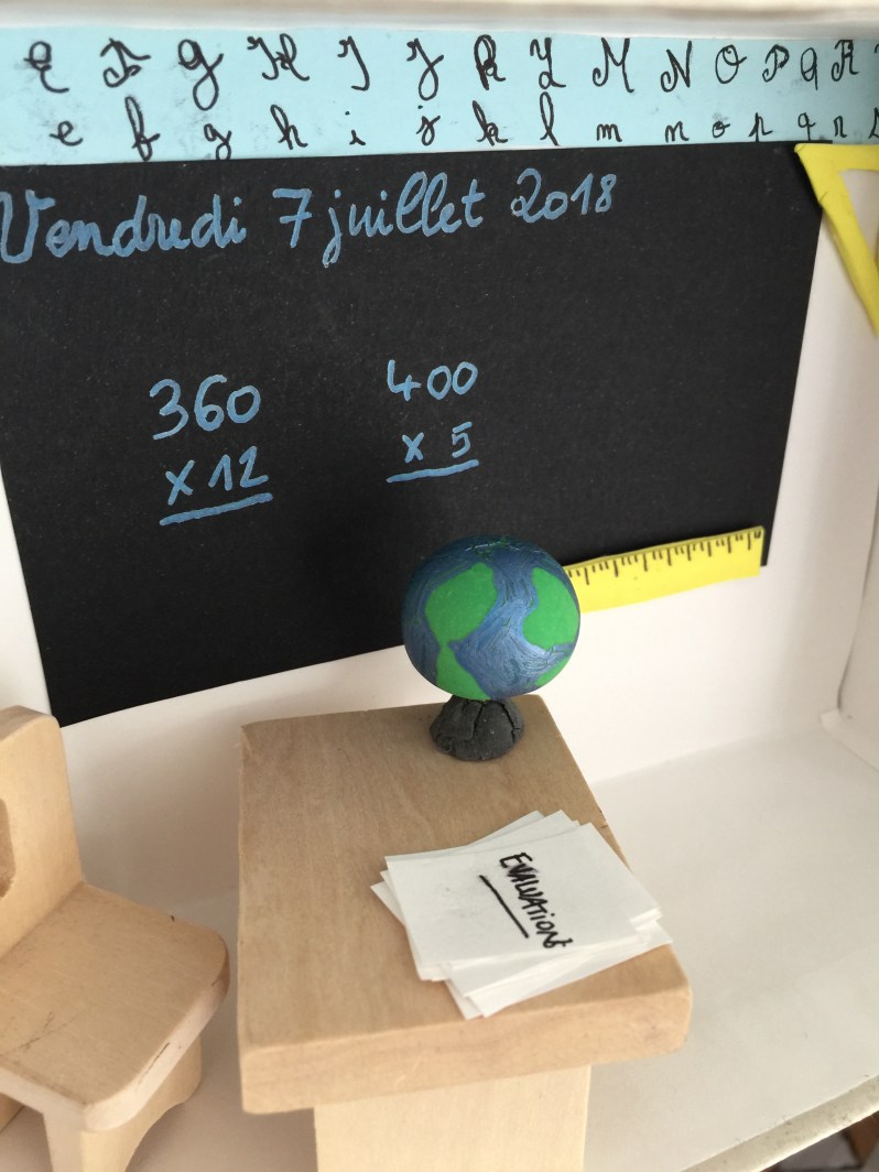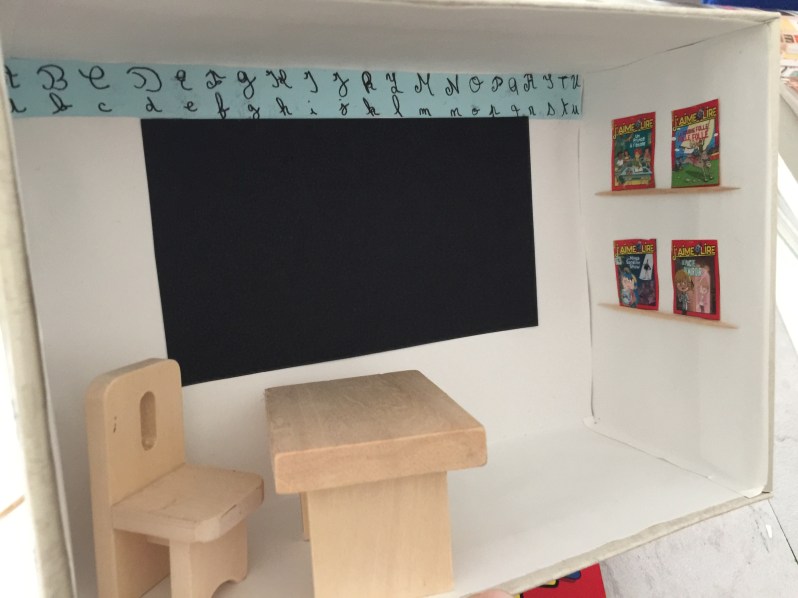 Nous avons recrée la classe de sa maîtresse en miniature. Je ne sais pas vous, mais Manon et moi on est fan de ce genre de petits univers !