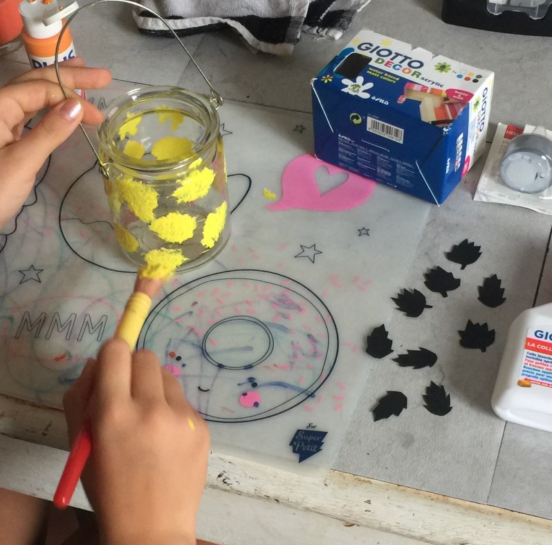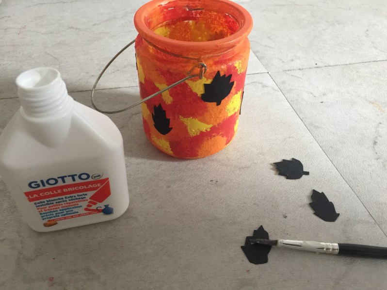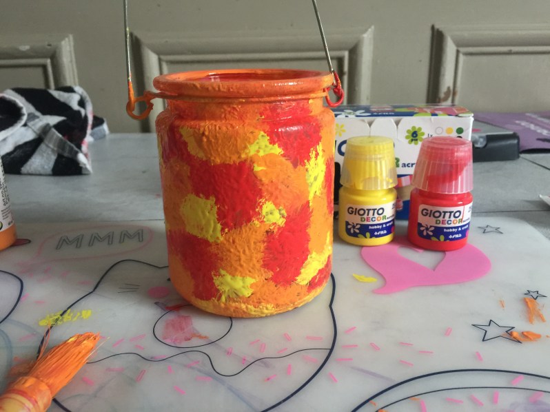 Manon a commencé par peindre à l’aide d’un gros pinceau rond le pot en verre. Le but étant d’avoir un effet naturel et donc pas linéaire ni parfait. Elle a utilisé 3 couleurs : jaune, orange et rouge !