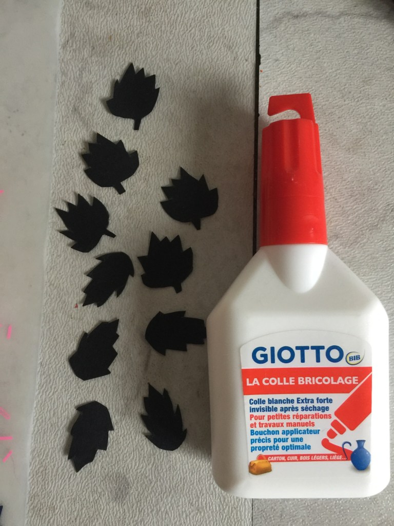 Ensuite elle a découpé des petites feuilles dans le papier noir canson, de formes différentes et les a collées à l’aide de la colle forte.