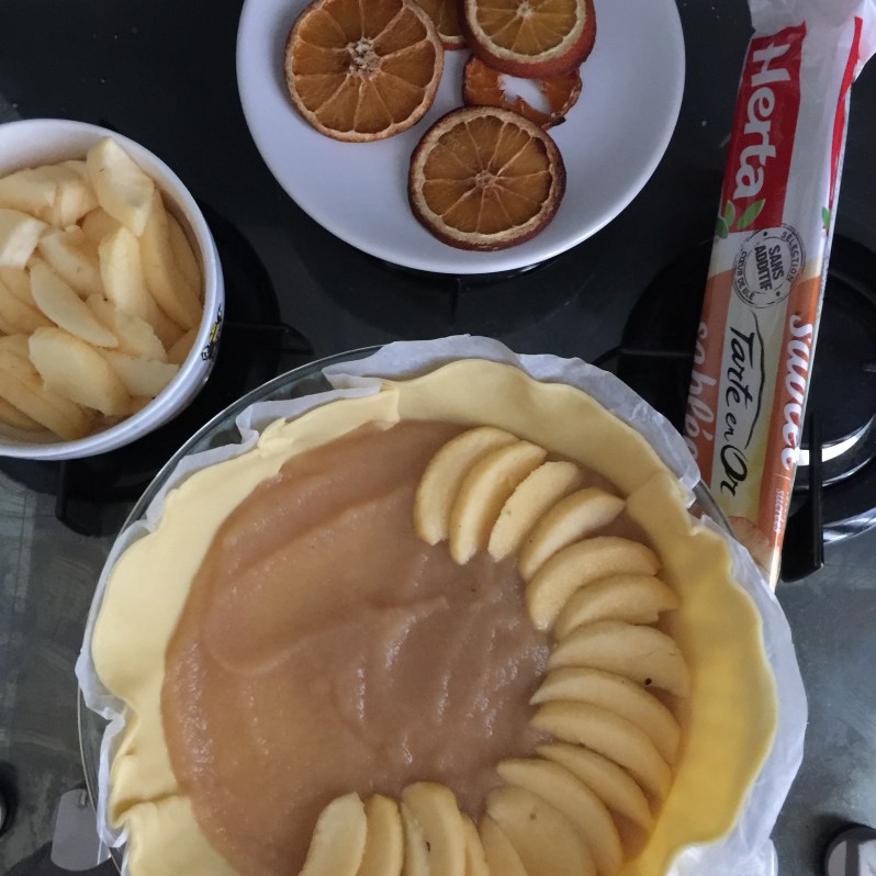 Je les ai ensuite déposées sur la compote et j’ai recouvert avec la seconde pâte, emporte-piécée. Avec la chute de pâte j’ai fait une tresse et j’ai enfourné 40 minutes à 200 degrés 🙂