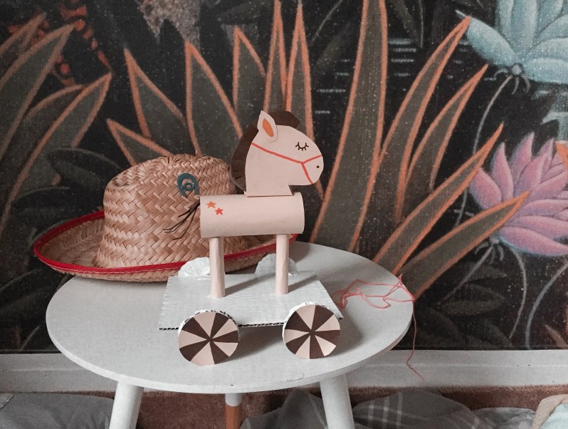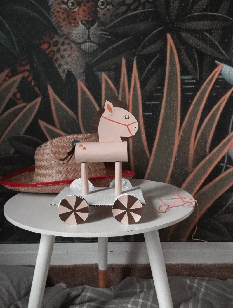 Aujourd’hui un tuto régressif et vintage à souhait: je vous montre comment fabriquer une petit cheval à tirer.