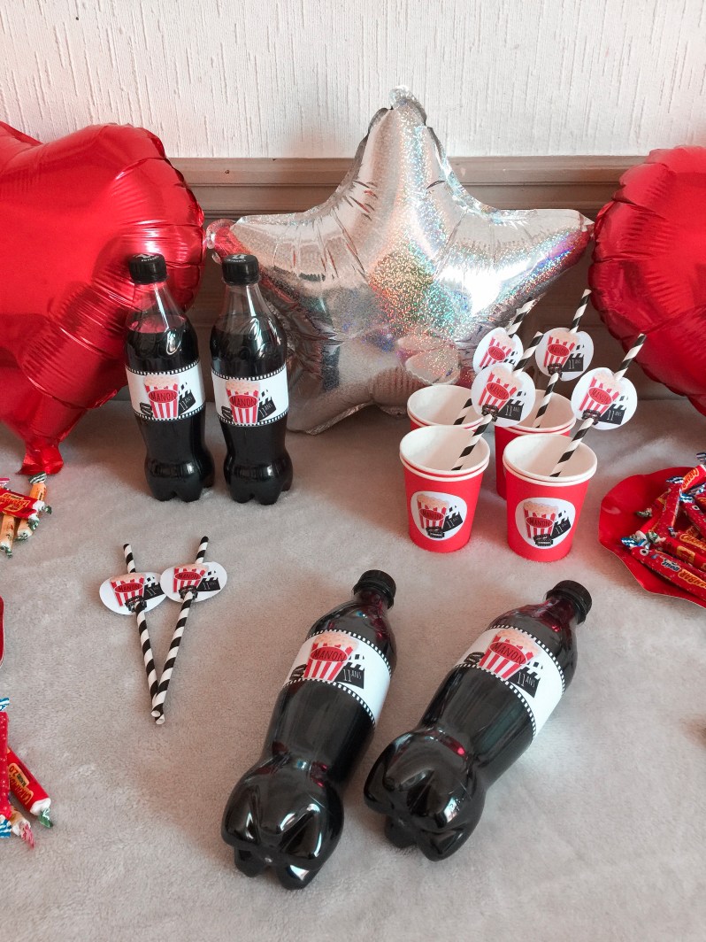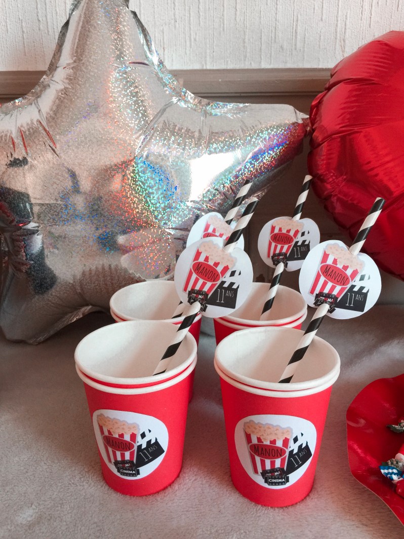 On a donc reçu les assiettes, une guirlande, des tours de bouteilles, des gobelets, des boites à pop corn, des sachets de bonbons, des pailles etc je vous conseille de jeter un oeil à son site, elle peut tout faire 🙂