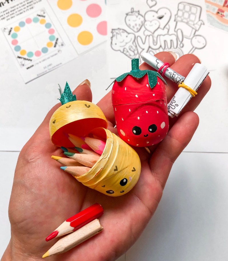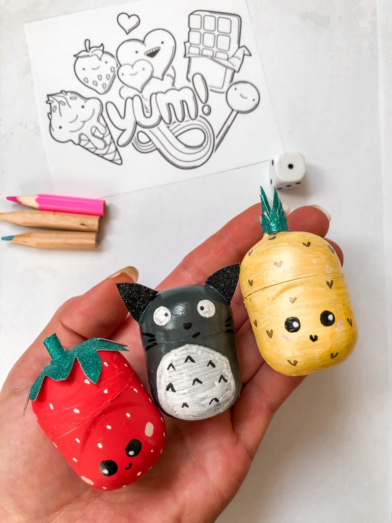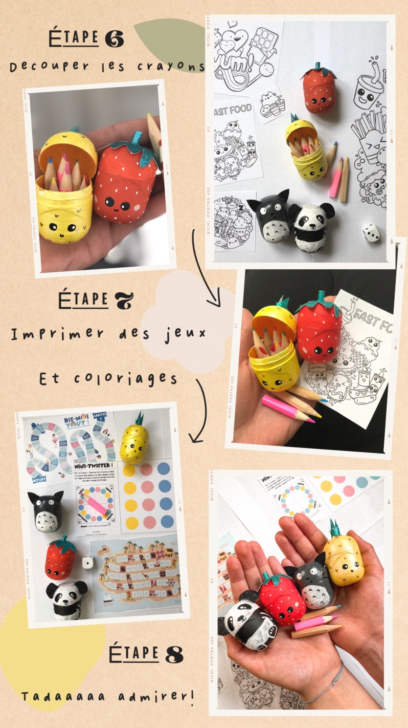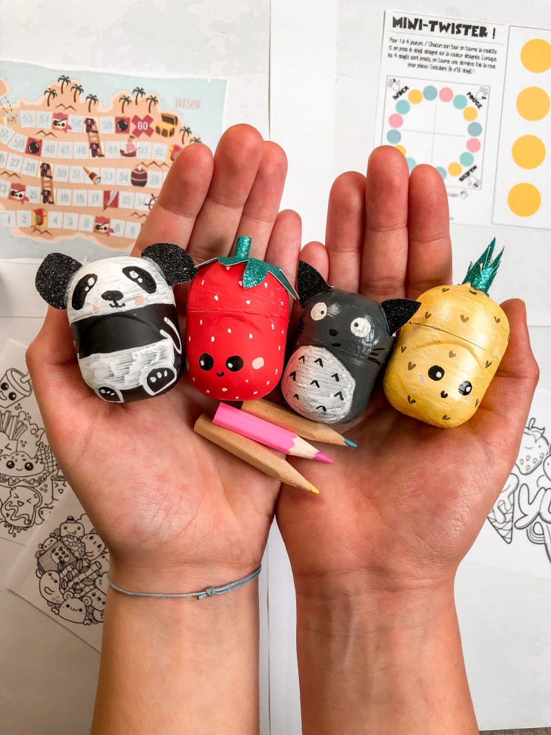 Je vous mets les étapes, rien de difficile! Il faut simplement décorer les boîtes Kinder, en veillant à utiliser de la peinture acrylique ou des marqueurs type posca qui iront sur le plastique.
