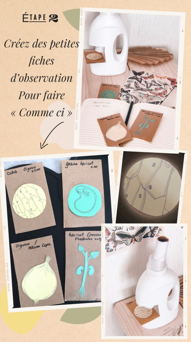 Comme je n’ai pas trouvé de système permettant de faire l’effet loupe, j’ai eu l’idée de faire des petites fiches d’observation : il vous suffit de dessiner des éléments, par exemple un oignon ou une goutte de sang, puis la même chose avec un grossissement fois 50 ou 100!