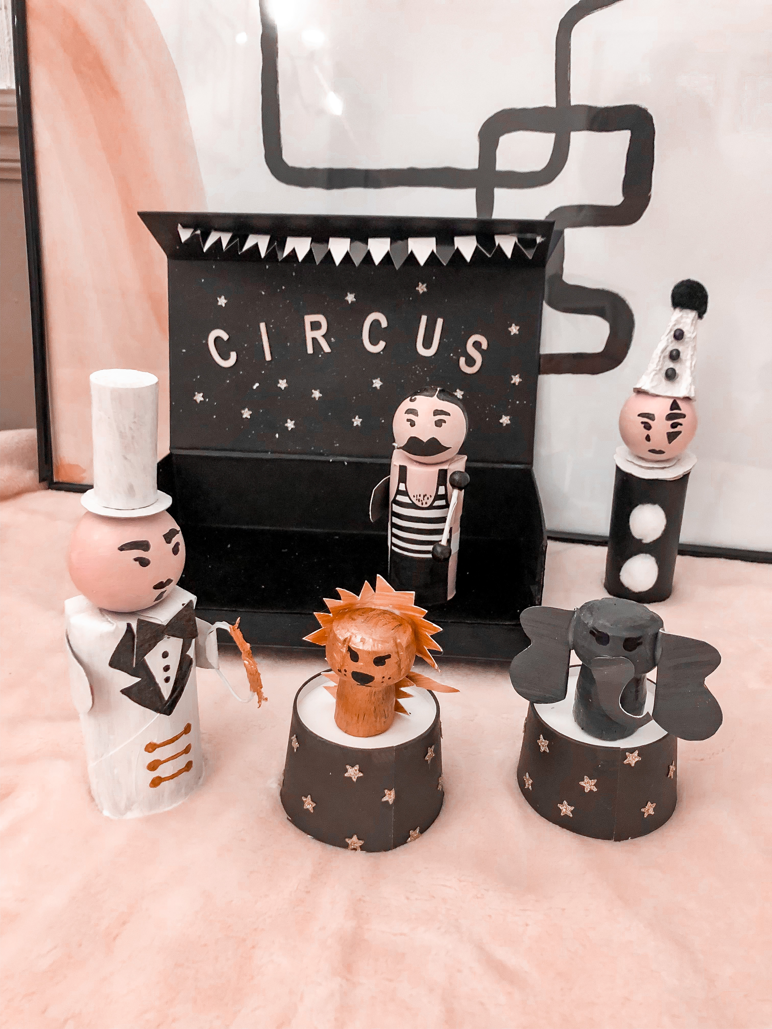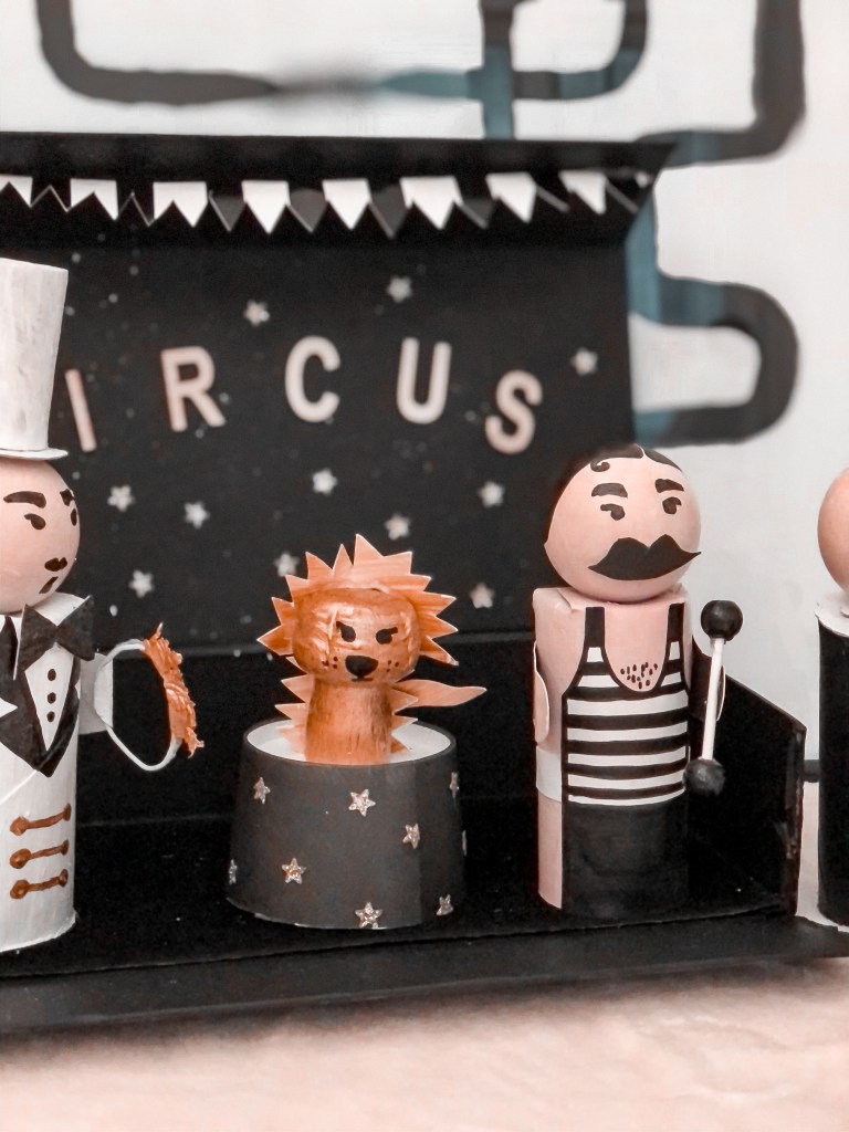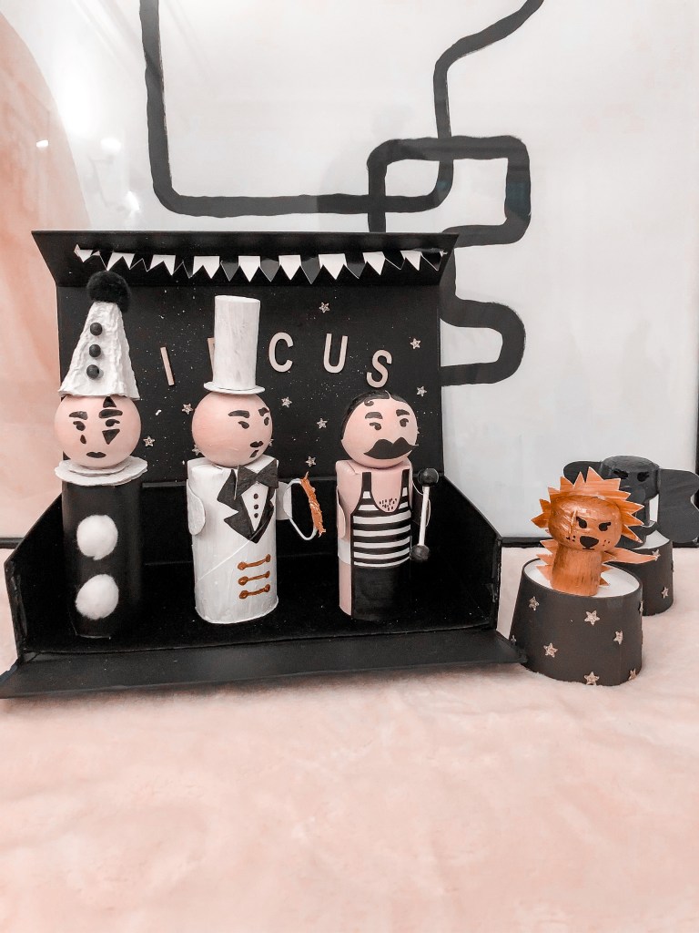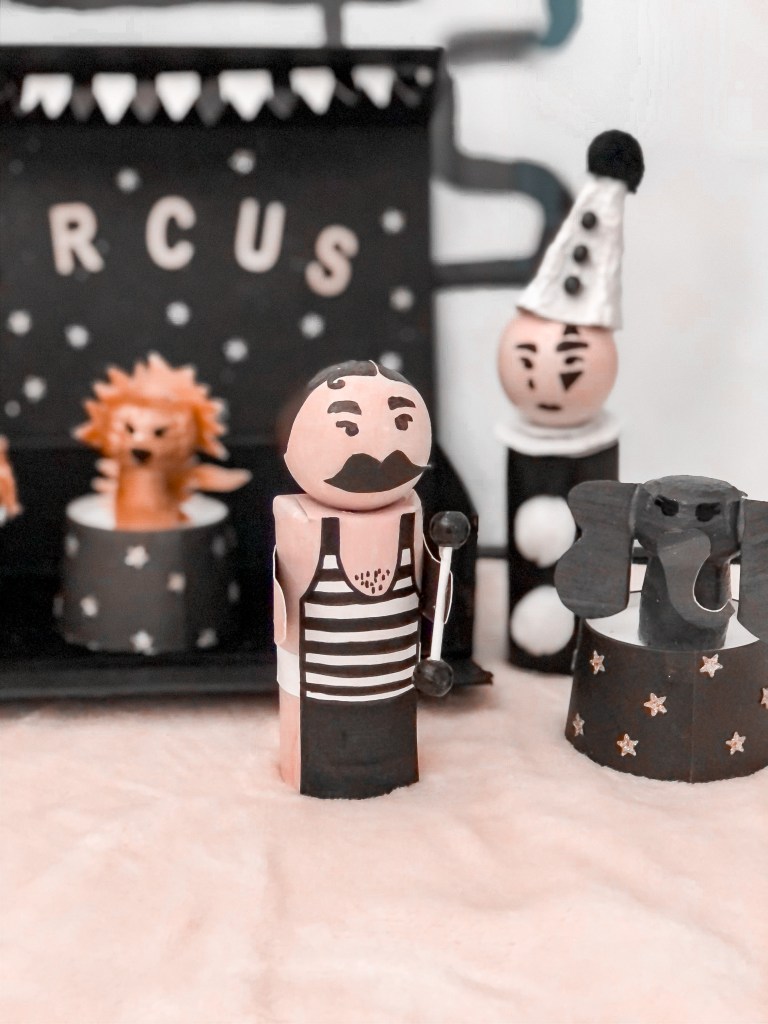 Pour les bonhommes : On a utilisé des rouleaux de papier toilette pour les corps, des perles en bois pour les têtes, on a peint tout ça puis on a fait des accessoires: les habits sont faits en papier épais puis collés, le chapeau avec une boîte d’oeuf, les haltères avec un coton tige et des petites perles en bois. On a aussi utilisé des pompoms pour le Pierrot et un marqueur noir Posca pour les détails. Pour le petit cerceau enflammé on a utilisé un trombone et de la colle chaude refroidie !