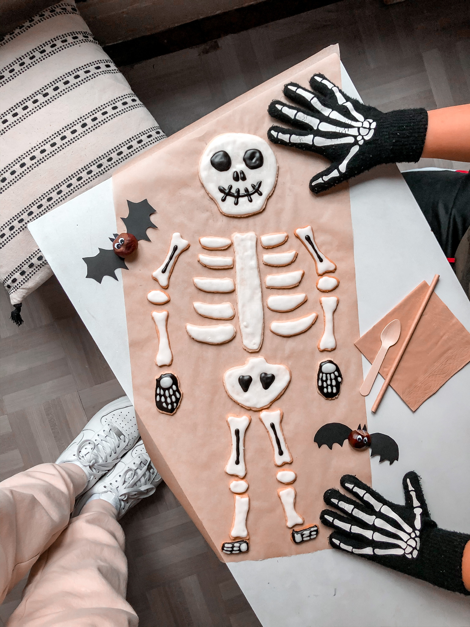 C’est en fait tout simplement un sablé géant décoré de glaçage royal 🙂 Plus il est grand et plus les enfants seront bluffés 🙂 Pour commencer dessinez les parties du squelette sur une feuille et découpez les (astuces, numérotez les pour ne pas mélangez les os après!) Ensuite préparez la pâte à sablés, la fiche recette est disponible ici (avec la recette du glaçage).