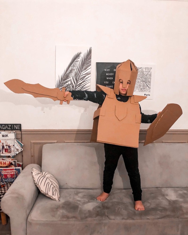 Le carton c’est la vie, on ne le répètera jamais assez ! Les enfants adorent se déguiser, pourquoi ne pas improviser un costume de chevalier? Ou une coiffe de licorne? C’est assez rapide et idéal à faire en famille! Je vous montre le costume improvisé pour Maé, pas de tutoriel, je me suis inspiré de photos trouvées sur Pinterest.