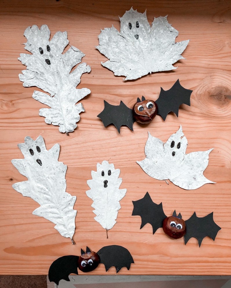En peignant de jolies feuilles en blanc vous obtenez des petits fantômes. Ave quelques marrons et du papier cartonné noir, vous obtenez de jolies chauves-souris 🙂
