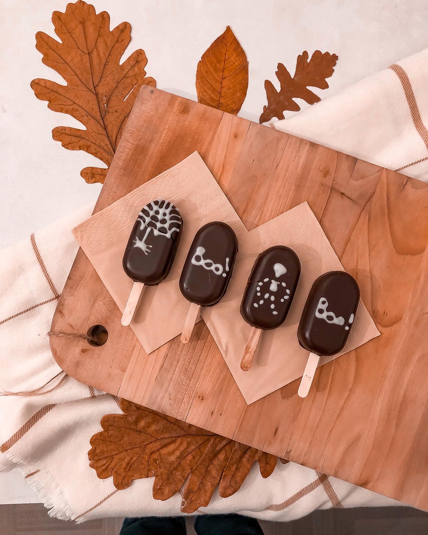 Pour le pas à pas, j’ai posté une vidéo sur Instagram. J’ai commencé par tapisser mes moules avec du chocolat noir fondu, puis mis au frigo 15 minutes. Puis j’ai mélangé du quatre quart effrité avec du mascarpone et de la crème de marrons (au pif, j’ai gouté!) puis j’ai versé dans mes moules à ras bord, puis j’ai inséré les bâtons (fournis avec les moules) puis recouvert à nouveau de chocolat fondu, puis 1 heure au frigo. Pour finir j’ai décoré avec un peu de glaçage blanc !