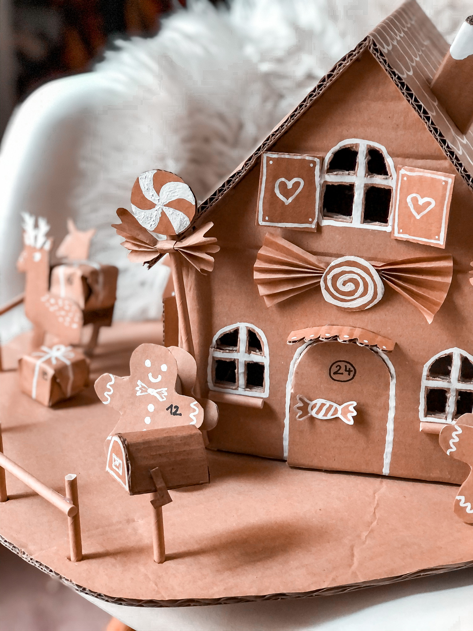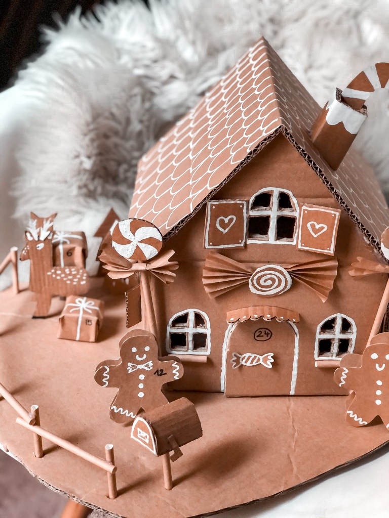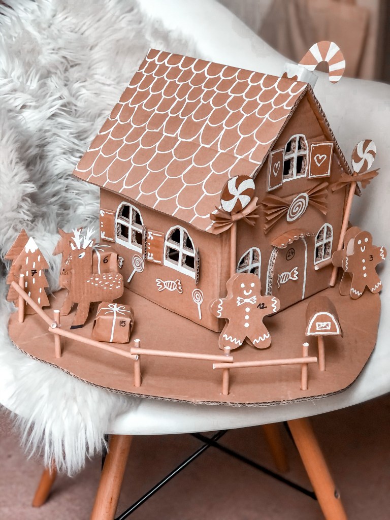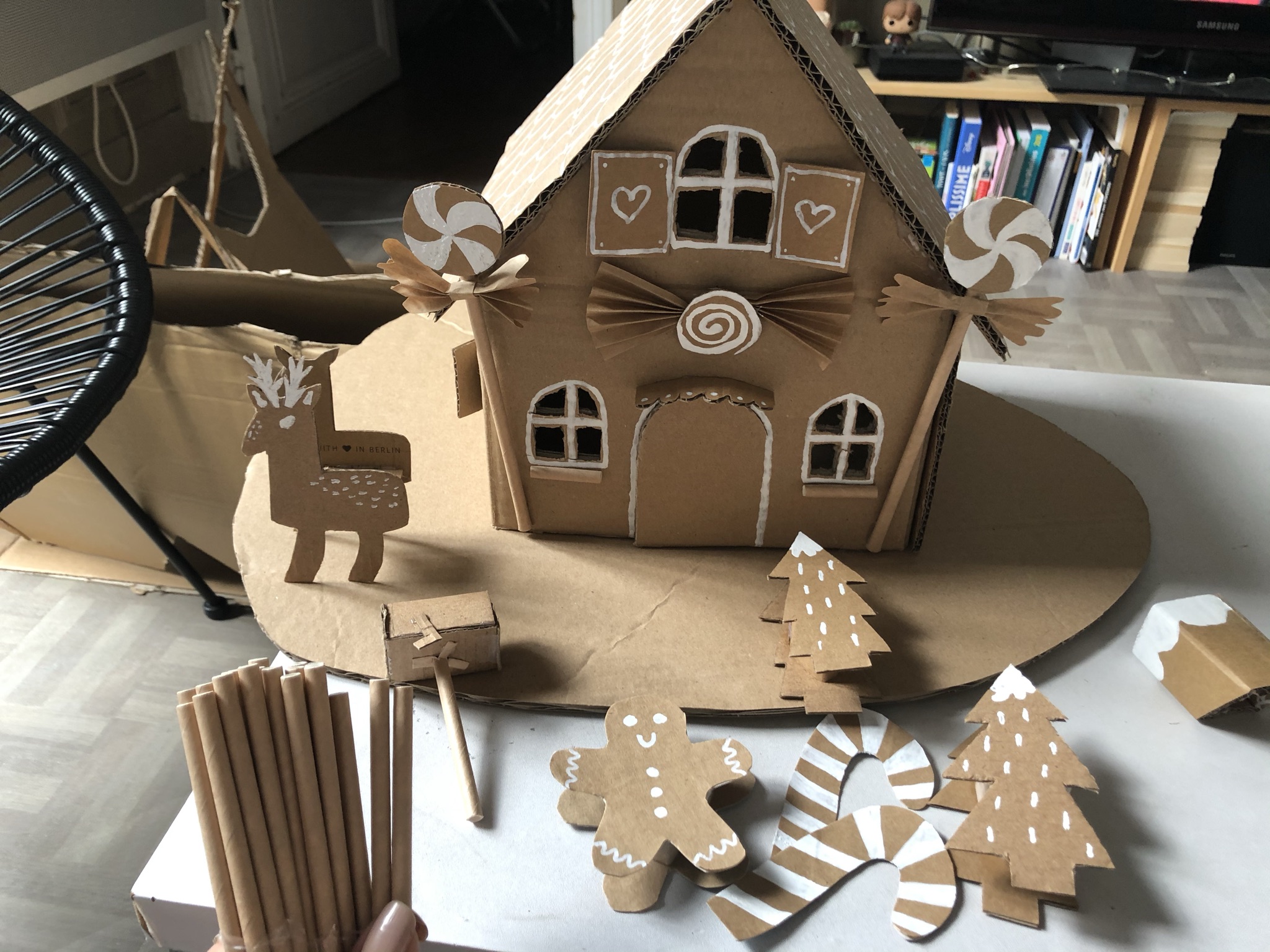 Vous pouvez aussi glisser une petite lampe à l’intérieur de la maison et l’allumer le soir, c’est super joli! Nous on va placer la maison au pied du sapin 🙂