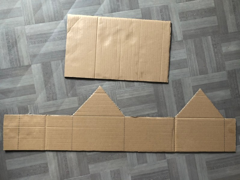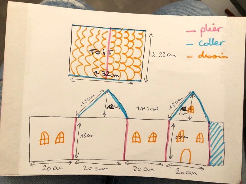 On passe ensuite à la maison, si vous avez un gros carton c’est idéal, sinon vous devez faire 4 faces puis les coller une à une. Mois j’ai découpé une grande bande de cartons de 85cm, puis j’ai plier tous les 20 cm, vous avez ainsi les 4 façades, les 5 cm restant servant à coller.