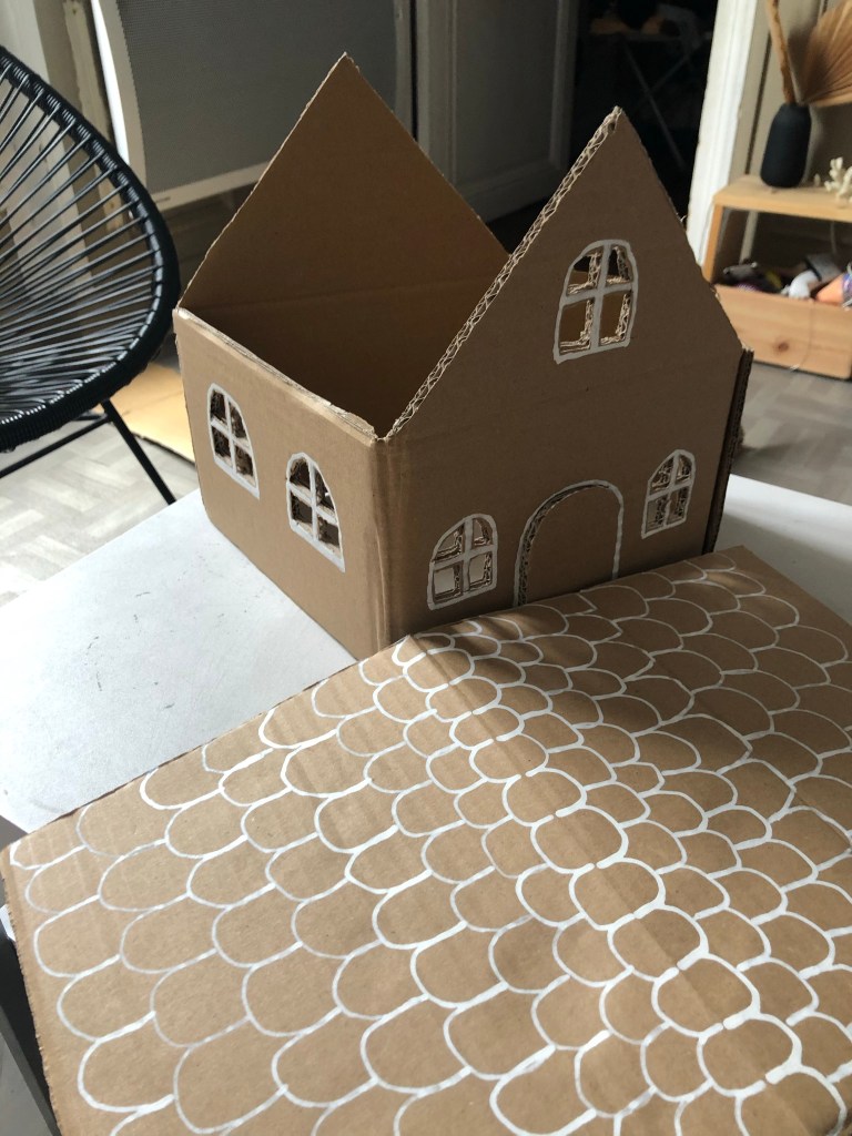 Astuce: Je vous conseille de faire comme moi: décorer votre maison au tipex et découper les fenêtres AVANT de coller la maison et le toit, c’est beaucoup plus simple à plat, surtout avec les enfants!