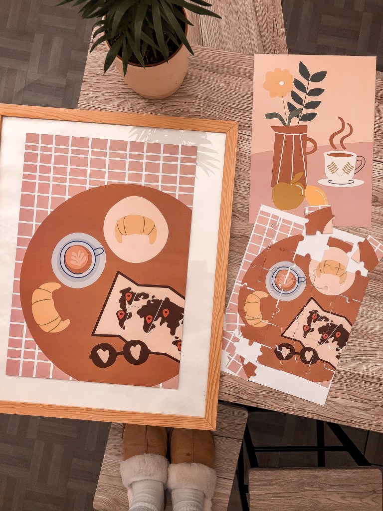 J’en ai imprimé en plus car j’hésitais entre A4 et A3, et puis en tombant sur une vidéo de quelqu’un qui s’ennuyait et faisait un puzzle, ça m’a donné l’idée d’en faire 🙂 Pour cela rien de compliqué, j’ai dessiné au dos des lignes et les « encoches » pour former les pièces et j’ai découpé ! On peut aussi coller sur du carton avant la coupe mais mon papier est bien épais 😉
