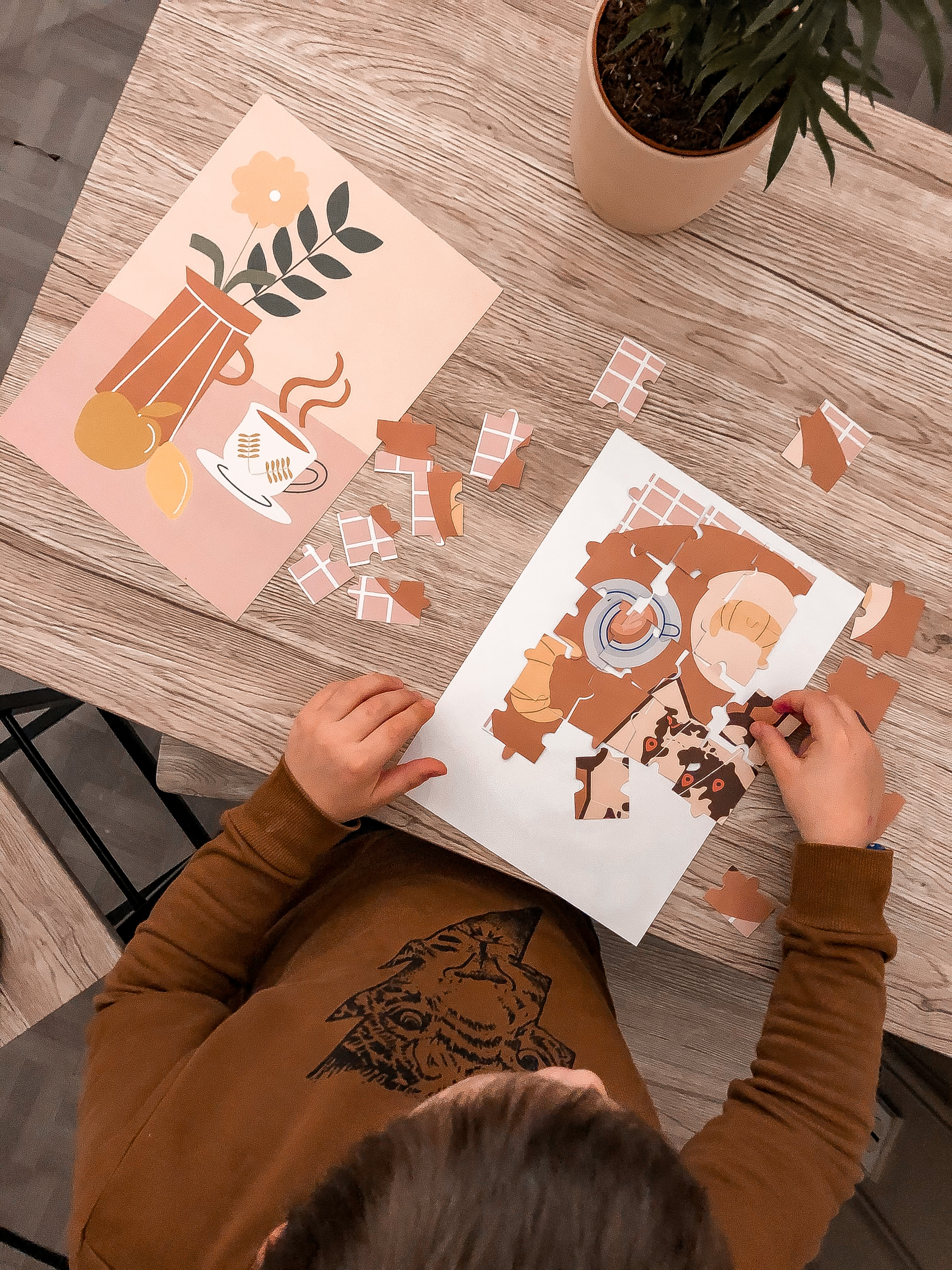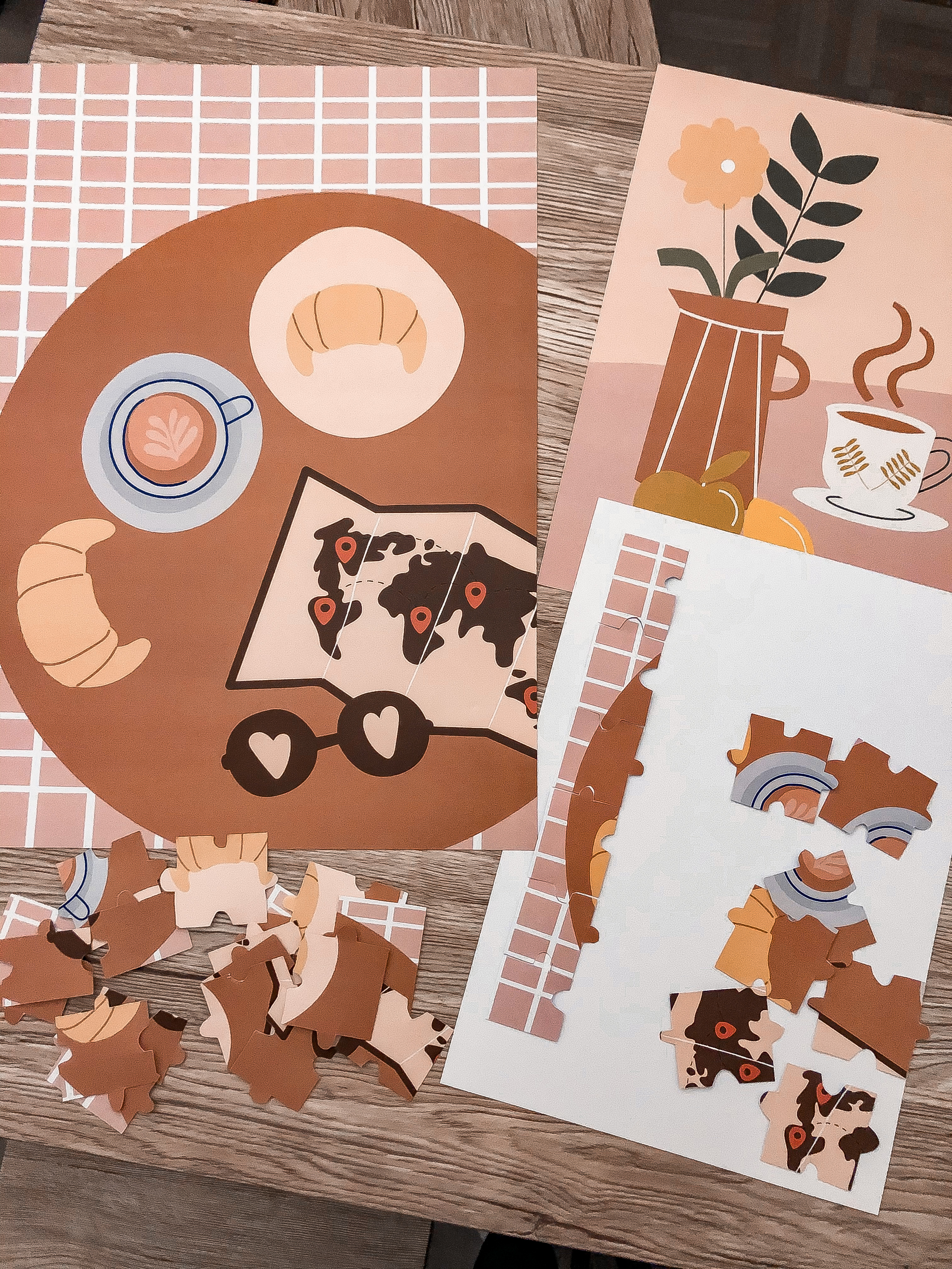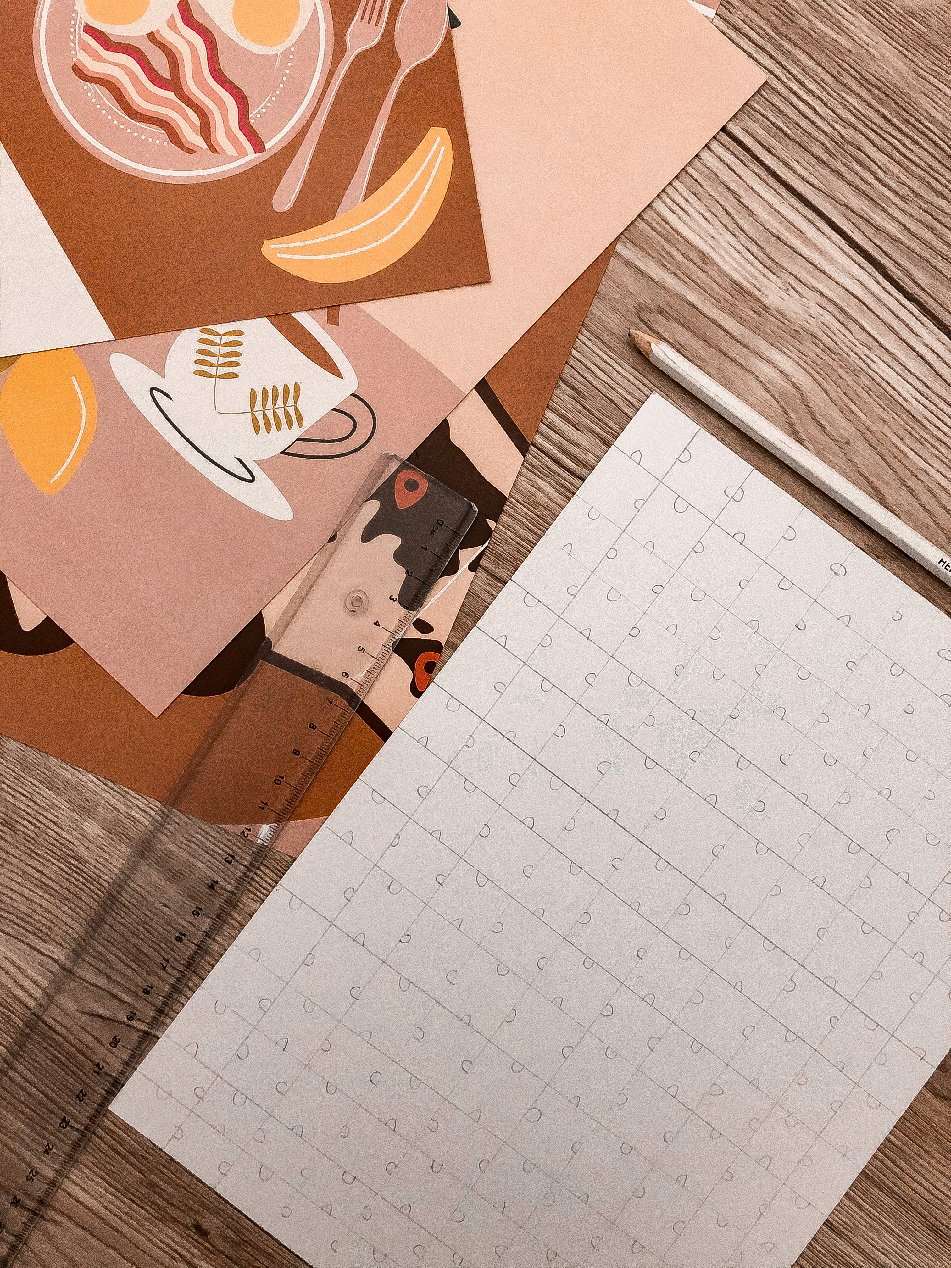 J’en ai imprimé en plus car j’hésitais entre A4 et A3, et puis en tombant sur une vidéo de quelqu’un qui s’ennuyait et faisait un puzzle, ça m’a donné l’idée d’en faire 🙂 Pour cela rien de compliqué, j’ai dessiné au dos des lignes et les « encoches » pour former les pièces et j’ai découpé ! On peut aussi coller sur du carton avant la coupe mais mon papier est bien épais 😉
